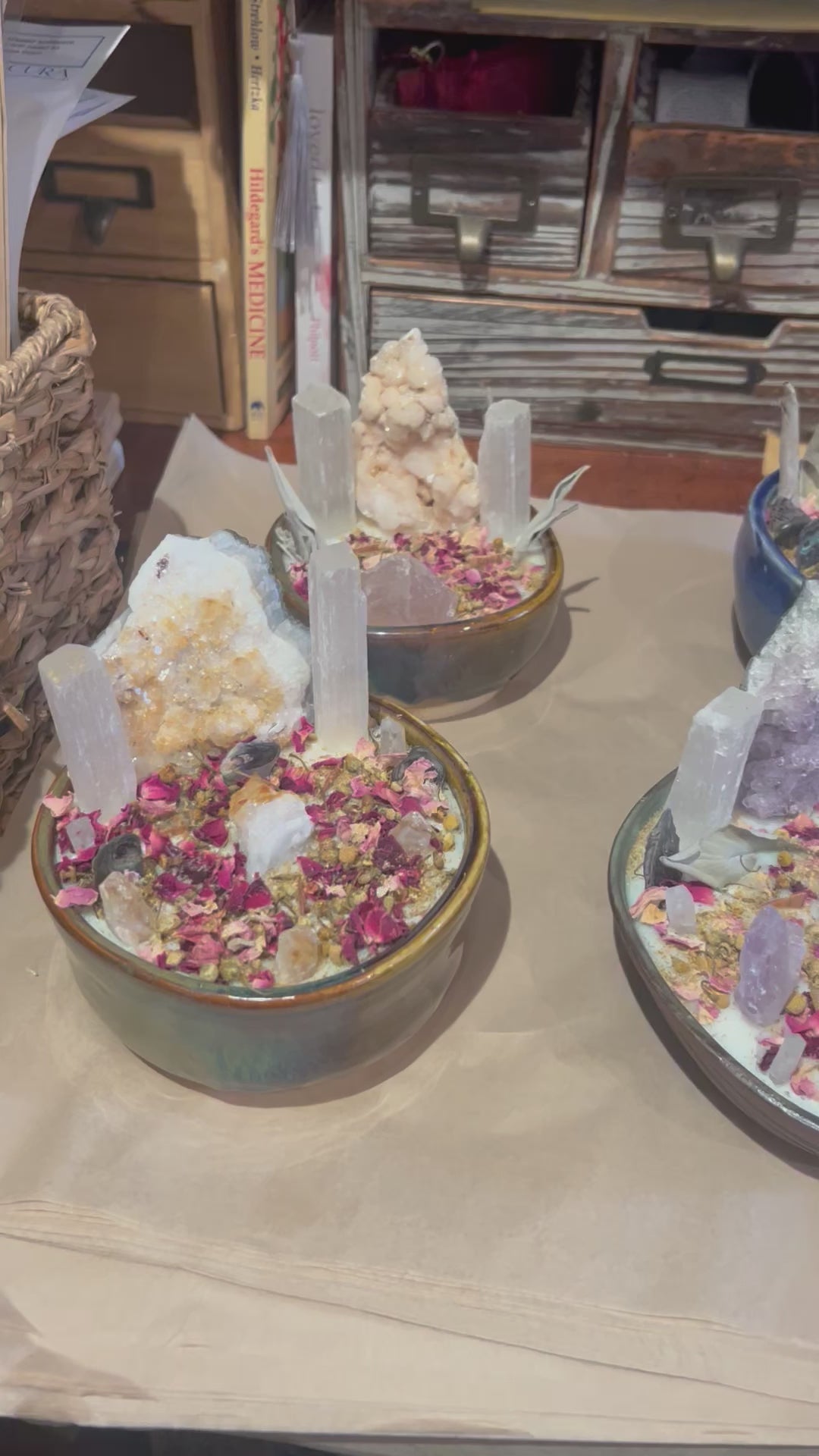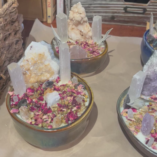 Two one of a kind Cydney Bender Crystal Candles, Eucalyptus essential oil, soy, coconut blend, wood wicks candles.